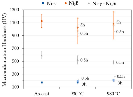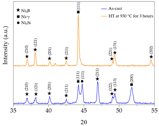 From the XRD spectra (the XRD pattern 980 °C/3 h is similar to that of the 930 °C/3 h, and so it was not included in Figure 5), a higher intensity of the Ni-γ (111) peak is observed and the Ni3Si peak is not detected (Figure 5). These results indicate that the reduction of the eutectic constituent (Ni-γ-Ni3Si) to values below the XRD detection limit and the consequent enrichment of austenite in silicon are certainly due to atomic diffusion. The stability of the borides is evident and, besides, new peaks in the spectra are not visible, which agrees with the SEM images.