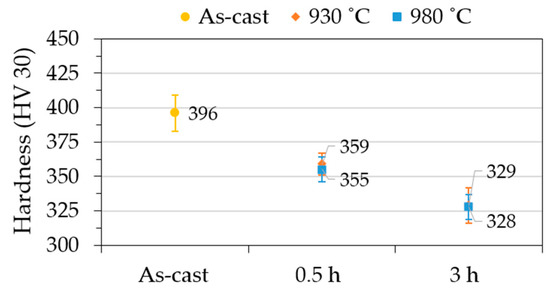 The enrichment of austenite in silicon during solution heat treatment enhances its hardness, as shown in Figure 6 (from 171 HV to 183 HV and 207 HV after 0.5 h at 930 °C and 980 °C, respectively). With the increase in holding time, the hardness of the austenite maintains stable for 930 °C and 980 °C. On the other hand, the dissolution of the eutectic regions results in a considerable softening of those regions during the dissolution process (from 593 HV to 522 HV and 483 HV after 0.5 h at 930 °C and 980 °C, respectively). The hardness average of the borides in the as-cast condition (1124 HV) also does not change significantly with the solution heat treatment. This variation is attributed to the smaller test load used that created smaller indentations that are much more sensitive to the measurement variation. Therefore, as shown in Figure 7, the microstructural transformations result in a significant decrease (17%) in the hardness of specimens from 396 HV to 329 HV and 328 HV after 3 h at 930 °C and 980 °C, respectively.