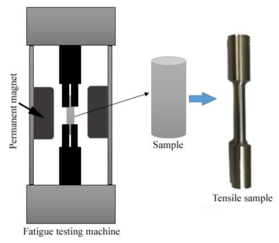 The illustration of fatigue tests containing magnetic field and the corresponding samples.