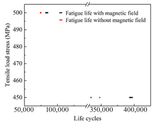 The fatigue life cycle under the load of 450 MPa and 500 MPa, with and without magnetic field.