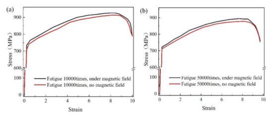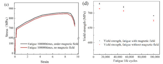 - The fatigue life cycles are slightly increased by about 10–15% under magnetic field of 1.2–1.3 T according to the experimental results. A small increment of yield strength under fatigue life cycles of 10,000, 50,000 and 100,000 times is caused by the magnetic field, with the enhancement of only 5–8 MPa.