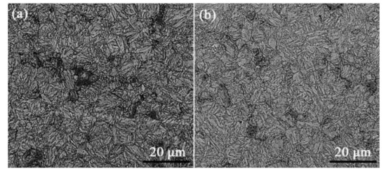 The microstructures of 35CrMo steel that experienced fatigue tests of 450 MPa for 10,000 cycles with and without magnetic field are shown in Figure 4a,b. It can be seen that very similar microstructures containing typical tempering structures of ferrite and cementites corresponding to the two states are revealed, due to the fatigue tests at room temperature, i.e., below the critical temperatures of microstructure or phase transformation. However, there should be some differences in the finer structures especially the dislocation distributions since the mechanical properties are influenced by magnetic field, which is discussed in the next section by the TEM observations.