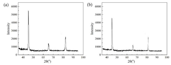 The similar results of X-ray diffractions (XRD) are shown in Figure 5, indicating that no apparent variation of microstructures are found in the specimens that experienced fatigue tests of 450 MPa for 10,000 cycles under magnetic field of 1.2–1.3 T (a) or no magnetic field (b), which is in good agreement with the SEM observations. However, the width of the diffraction peaks may be different although it is difficult to distinguish it by direct observation of Figure 5a,b. The half band width (I) of XRD patterns can be quantitatively estimated by the software JADE-5 and Origin. The XRD results are considered as an evidence on the variation of dislocation distributions influenced by magnetic field, as shown in Figure 5a,b, since the relationship between half band width of XRD patterns and dislocation densities have been investigated and proved in other works [26,27]. The width of diffraction peaks along (110) and (200) direction is found increased in the specimen that experienced fatigue tests of 450 MPa for 10,000 cycles under magnetic field of 1.2–1.3 T than the ones without magnetic field, by comparing the XRD results in Figure 5a,b. It has been widely accepted that the dislocation density in material can be related and estimated by the half band width of diffraction peaks along the crystal orientation of dislocation slip [26]. The relationship between dislocation density D and half band width I of diffraction peaks can be expressed as [28]: