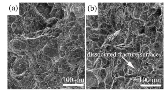 Some differences of deformation behaviors can also be reflected by the fracture morphology of tensile specimens that experienced fatigue tests of 50,000 cycles under the load of 450 MPa with and without magnetic field, as shown in Figure 6. Similar fracture morphology containing a combination of dimples and inter-granular surfaces is revealed in Figure 6a. However, it can be seen that more amount of dissociated fracture surfaces are found in the fracture morphology of magnified photographs in Figure 6b, compared with that in Figure 6a. This difference can be attributed to the influence of magnetic field on the dislocation distributions. It is suggested by the dissociated fracture surfaces shown in Figure 6b that the ductility and plasticity of the material are reduced by fatigue tests due to the formation of micro-defects [21,23,29]. The material has intrinsic defects, such as, dislocation, void, and so on, where stress concentration is easy to occur and the stress intensity could be larger. More amount of dimples as shown in Figure 6a may suggest that more dislocations are formed and pinned by the magnetic domain walls, which are coherent with the XRD results.