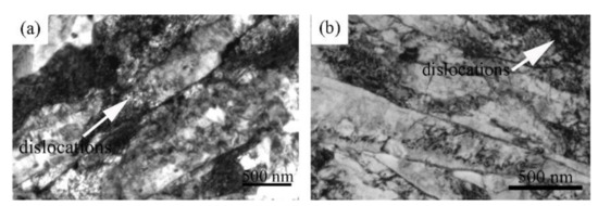 This dislocation distribution behaviors can be confirmed by TEM observation in Figure 7. It is clearly seen in Figure 7a that larger number of dislocations are found at the grain boundaries and inside the grains in the specimens that experienced fatigue tests under the magnetic field, compared with the photograph observed in the one without magnetic field as shown in Figure 7b. It can be seen that the distributions of dislocations is fairly uniform at the grain boundaries and inside the grains, compared with the fatigue behaviors without magnetic field which have been reported otherwise [21,22,23]. The influence of magnetic field on the distributions of dislocations has been confirmed by several studies [18,27,28] that the dislocations at the grain boundaries of the sample are dispersed and diffused from the grain boundaries to the inside of the grains with magnetic field due to the influence of magnetic domain walls. Meanwhile, the dislocation structure at the grain boundaries can spread widely and a large number of dislocations appear in the grains with higher magnetic field. Therefore, it is reasonable to believe this change in dislocation structure can lead to a more uniform distribution of residual stress. Therefore, the dislocation structure becomes more uniform, as shown by the comparison of Figure 7a,b, suggesting that the homogeneity of the material also improves. Then the formation of micro-defects or micro-cracks will be postponed by the improvement in homogeneity of the material, leading to the increase of fatigue life cycles of the steel. As for the mechanical properties of 35CrMo steel that experienced the fatigue tests, this uniformly distributed dislocations are also helpful to improve the strength. It is then suggested that deformation hardening and dislocation hardening effects shall be increased by the observation of many dislocation-entangled structures revealed in Figure 7 and the higher density determined based on the XRD results in Figure 5. Another estimation from the rather small value of increment of mechanical properties as mentioned in the previous section is that the influence of magnetic field is limited at room temperature, since the movement ability of dislocations is low and no phase transformation and precipitation occur.