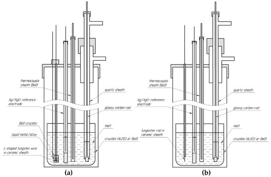 Experimental cells for studying polarization of liquid (a) and solid (b) metal cathodes in LiCl–KCl based melts.