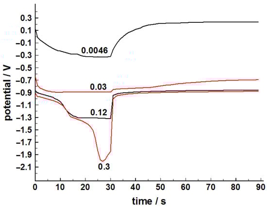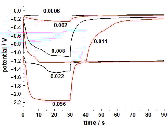 Examples of the potential–time dependencies recorded after applying and switching off polarizing current in zirconium and uranium containing melts are presented in Figure 2 and Figure 3, respectively. Depending on the cathodic current density potentials were stabilized at certain values corresponding to particular electrochemical processes.