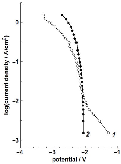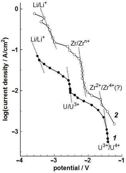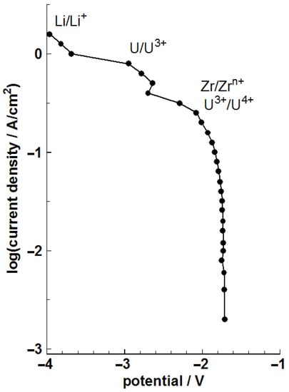 Examples of cathodic polarization curves obtained on a solid tungsten electrode in chloride melts containing zirconium or uranium ions are presented in Figure 4. Cathodic polarization curve recorded in the zirconium containing melt had two regions of potential stabilization, around −2.1 and −3.2 V vs. 2Cl−/Cl2 reference couple. First potential corresponded to the reduction of zirconium ions to the metal. Zirconium deposition potentials obtained on tungsten cathodes were −(2.05–2.10) V at 532–544 °C and zirconium concentration in the melt of 2.14 wt. %. These values agree well with the results obtained previously using transient techniques [].