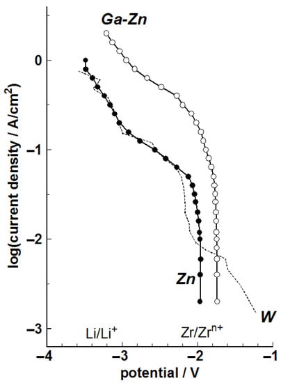 Zinc and gallium–zinc eutectic alloy were tested as the cathode materials for the reduction of zirconium. Cathodic polarization curves obtained for liquid Zn and Ga–Zn electrodes in in 3LiCl–2KCl–ZrCl4 melts are presented in Figure 6. The results for solid tungsten electrode are included in the figure for comparison. Polarization curves recorded on liquid cathodes had clear potential stabilization regions around −(1.7–2.0) V corresponding to zirconium reduction and below −3 V corresponding to alkali metal reduction. Zirconium deposition potentials thus obtained were −1.97 V for zinc (567 °C) and −1.74 V for Ga–Zn alloy (550 °C). Changing from tungsten to zinc thus resulted in ca. 0.13 V positive shift of zirconium deposition potential. Gallium–zinc alloy demonstrated the most positive zirconium deposition potential value of −1.74 V, i.e., 0.35 V more positive than on tungsten, making this alloy an interesting candidate material for uranium and zirconium separation.