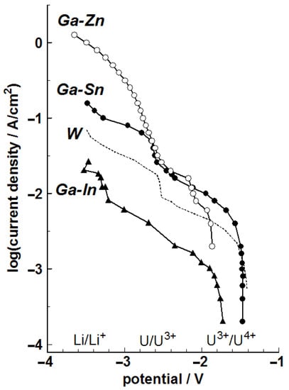 Active (solid or liquid) metal electrodes can be used to alter deposition potentials due to formation of alloys or stable intermetallic compounds with deposited metal. Choosing appropriate electrode material can improve selectivity of the deposition process and increase separation of metals with close electrochemical properties. Various metals, normally with low melting points, are used as so-called “active” liquid cathodes. Electrochemistry of uranium on various liquid metal electrodes in chloride melts was studied [,,] but substantially less attention was paid to reduction of zirconium chloro-species on liquid metals. Cyclic and differential pulse voltammetry was previously employed for assessing zirconium deposition on various liquid cathodes including gallium, indium and zinc [,,]. A positive shift of zirconium deposition potential was observed on liquid “active” electrodes compare to an “inert” solid tungsten electrode due to formation of intermetallic compounds. Potentiostatic electrolysis on a zinc cathode at −(1.9–2.2) V vs. 2Cl−/Cl2 reference couple yielded Zn22Zr phase []. Preliminary studies showed that cathodic polarization measurements could provide a valuable insight into zirconium and uranium deposition behavior on liquid metal cathodes [,]. Analysis of the polarization curves allowed determining the potentials at which the cathodic reactions took place, including U4+ → U3+, U3+ → U0 and Zrn+ → Zr0 reduction and evaluating applicability of various materials for separation of these two metals. The present study was primarily aimed at application of cathodic polarization measurements for determining the effect of the electrode material on the deposition potentials of uranium and zirconium in order to select the electrode with increased difference of deposition potentials for enhancing possible Zr/U separation factor.