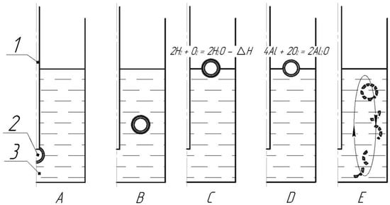 The process diagram: 1. Tuyere. 2. Oxygen bubble. 3. Aluminum alloy melt. (A)—bubble formation; (B)—bubble flotation, hydrogen is adsorbed on it; (C)—hydrogen burning on the melt mirror; (D)—formation of aluminum gaseous suboxides; (E)—bubble disintegration, oxide particles saturate the melt