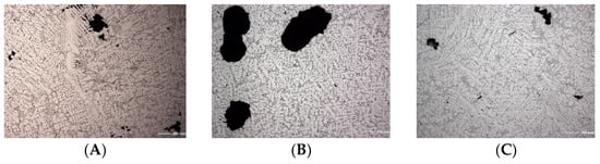 Casting of aluminum matrix composite. (A) Composite, blowing to the full burn out of hydrogen; (B) Composite, incomplete burn out of hydrogen; (C) Alloy without blowing.