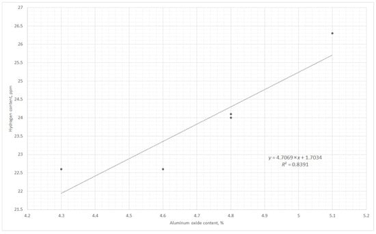 Hydrogen in the composite, upon completion of the burning on the melt mirror can only be in the bound state, adsorbed on the aluminum oxide surface. The dependence of the hydrogen content in the composite may be presented graphically (Figure 5), the linear trend is described by Equation (1):