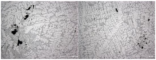A polished section of the specimen without blowing demonstrates a smaller hydrogen porosity than in the case with incomplete blowing. This is due to the fact that, when a melt is loaded into a mold, the burning of hydrogen begins on the “metal-mold” interface, and a crust on the casting surface is not formed for quite a long time, thus, assuring the melt degassing. Still, gaseous porosity in the hydrogen-charged melt is present, pores have a high dispersion in their sizes, there are both pores that are 300 µm and small pores that are 50 µm (Figure 6). A small size of hydrogen pores demonstrates the low temperature gradient during the crystallization of the casting.