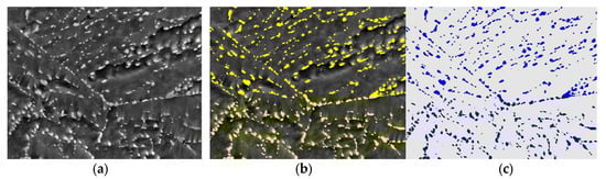 An example of image modification using GIMP and FIJI software: (a) SEM micrograph of precipitates, (b) SEM micrograph with a single-colored over-painting of precipitates, (c) single-colored representation of precipitates without the SEM micrograph.