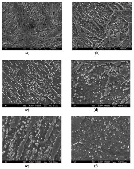 SEM micrographs of the α + γ (Figure 3) and γ (Figure 4) HAZ microstructures of X20 and P91 steels for are shown for initial state, after tempering for 720 h at 650 °C, and after tempering for 720 h at 750 °C. In Figure 3 and Figure 4, in X20 steel, a higher amount of carbide particles with more uniform distribution was observed than in P91 steel, which was true for both HAZ microstructures and for both tempering temperatures. A more detailed analysis of the SEM micrographs can be found in a previous study of the authors [].