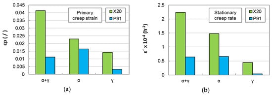 Creep performance of α + γ, α, and γ microstructures of the X20 and P91 steels at the initial state: (a) primary creep strain, (b) stationary (secondary) creep rate.