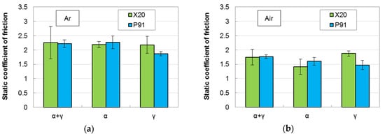 Figure 8 shows static coefficients of friction of three different microstructures of the X20 and P91 steels at the initial state measured in Ar (Figure 8a) and air (Figure 8b) atmospheres. In Figure 8, for both steels, coefficients of friction were higher in Ar atmosphere (Figure 8a) where values between 1.9 and 2.3 were measured, while in air atmosphere (Figure 8b), values between 1.4 and 1.9 were measured. It should be pointed out for all samples, that during the first few sliding cycles in Ar atmosphere, significantly lower friction values (0.3 to 1) were measured []. This shows that the surfaces were initially covered with a frictionally favorable oxide layer, which was quickly removed due to sliding under high contact pressure. Thus, the high friction values in Ar atmosphere can be attributed to the absence of any reactive molecules in the contact which could prevent from a direct steel/steel contact leading to the very high metal–metal adhesion and the consequent cold-welding of the asperities of contacting bodies []. On the other hand, the coefficient of friction values in air atmosphere are unusually high (based on previous studies of the present authors [,], values of around 1 were expected), which could be attributed to the fact that (i) the surfaces were roughened during the test in Ar atmosphere which led to mechanical anchoring of the asperities and/or (ii) the nascent steel surfaces from the test in Ar atmosphere could not fully re-oxidize within the relatively short test time in air (2 min).