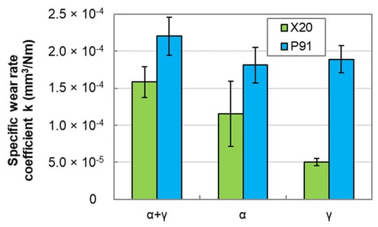 Specific wear rate coefficients of α + γ, α, and γ microstructures of the X20 and P91 steels at the initial state.