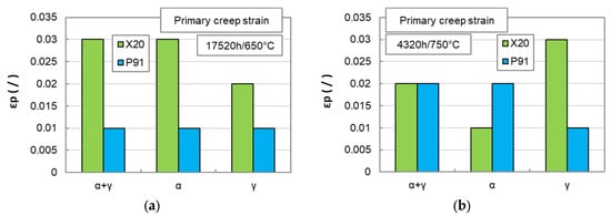 In Figure 11, primary creep strain values of three different microstructures of the X20 and P91 steels after aging for 17,520 h at 650 °C (Figure 11a) and 4320 h at 750 °C (Figure 11b) are shown. In Figure 11a, after aging for 17,520 h at 650 °C, primary creep strain was always higher for the X20 steel than for the P91 steel. For the X20 steel, the creep strain of α + γ and α microstructures was 0.03, while for γ microstructure it was around 30% lower, having a value of 0.02. For the P91 steel, all microstructures provided identical creep strain of 0.01. With aging for 4320 h at 750 °C (Figure 11b), for the X20 steel, creep strain was the lowest for α, slightly higher for α + γ, and the highest for γ microstructure with values of 0.01, 0.02, and 0.03, respectively. For the P91 steel, creep strain of α + γ and α microstructures was 0.02, while for γ microstructure it was 50% lower, having a value of 0.01.