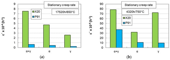 In Figure 12, stationary creep rate values of three different microstructures of the X20 and P91 steels after aging for 17,520 h at 650 °C (Figure 12a) and 4320 h at 750 °C (Figure 12b) are shown. It should be noted that in Figure 12a, the scale on the y-axis is 10-times smaller compared to Figure 12b. Generally, for stationary creep rate, similar trends were observed as for primary creep strain in Figure 11. Namely, stationary creep rate was always higher for the X20 steel than for the P91 steel, which was especially pronounced after aging for 17,520 h at 650 °C (Figure 12a). After aging for 17,520 h at 650 °C, the stationary creep rate was the highest for α + γ microstructure of the X20 steel with a value of 7.5 × 10−4 h, was around 35% lower for α with a creep rate of 4.7 × 10−4 h, and was the lowest for γ microstructure with a creep rate value of 2.6 × 10−4 h. For the P91 steel, the same trend was observed as for the X20 steel, with α + γ microstructure having the highest and γ microstructure the lowest creep rate; however, compared to the X20 steel, the wear rates were around 90% lower. After aging for 4320 h at 750 °C (Figure 12b), for the X20 steel, stationary creep rate was the lowest for α having a value of 32 × 10−4 h, while it was more than 2-times higher for α + γ and γ microstructures with values of 78 × 10−4 h and 72 × 10−4 h, respectively. For the P91 steel, creep rate was the lowest for γ and the highest for α + γ microstructure, and the creep rate values were 50 to 85% lower than in the X20 steel.