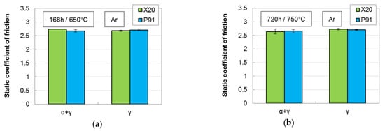 Static coefficients of friction in Ar atmosphere of α + γ and γ microstructures of the X20 and P91 steels after aging for (a) 168 h at 650 °C and (b) 720 h at 750 °C.