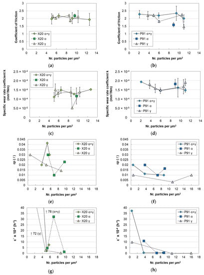 In Figure 16, static coefficients of friction in air atmosphere (Figure 16a,b), specific wear rate coefficients (Figure 16c,d), primary creep strain (Figure 16e,f), and stationary creep rate values (Figure 16g,h) for α + γ, α, and γ microstructures of the X20 and P91 steels are presented in dependence of number of precipitates.