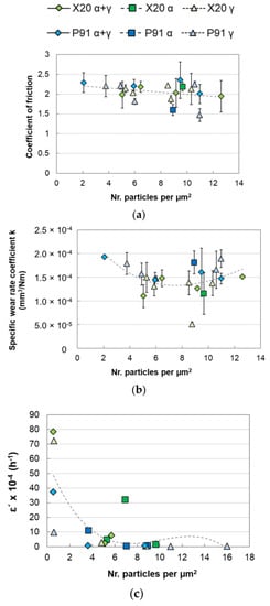 In Figure 16c,d, for both steels, the minimum wear was reached at an approximately intermediate number of precipitates. For the X20 steel, this was at around 9 precipitates per μm2, while for the P91 steel, it was at around 6 precipitates per μm2. However, both steels showed a slightly different wear behavior in relation to the number of precipitates. For the X20 steel, at the lowest number of precipitates, relatively low wear values were measured, which were also lower compared to the wear values at the highest number of precipitates. On the other hand, for the P91 steel, at the lowest number of precipitates, the highest wear values were measured and at the highest number of precipitates, wear values were generally low, but had a high fluctuation in measured values depending on the type of the microstructure (α + γ, α, and γ). Similar as for coefficients of friction (Figure 16a,b), for the X20 steel, the wear values were slightly lower than for the P91 steel; however, the difference between the minimum and the maximum wear value was higher for the X20 steel.