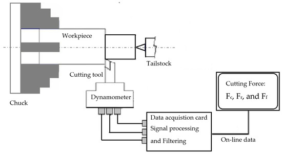 There are three cutting force components of the cutting force (F) in a turning process, which are designated according to the direction of the cutting tool’s relative movement to the workpiece (Figure 1). The cutting force components are tangential force (Fc) in the direction of the main cutting action, radial force (Fr) in the direction toward the axis of the workpiece, and feed force (Ff) in a parallel direction to the workpiece axis [16,17].