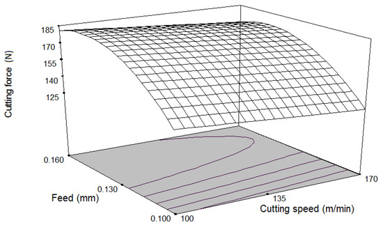 The final model Equation for cutting force can be shown as a 3D contour graph (Figure 3). From Equation (13) and Figure 3, it can be observed that the cutting force is affected significantly first by the feed and second by the cutting speed. Generally, the feed is proportional to the cutting force while the cutting speed is inversely proportional to the cutting force. The proportionality relation between feed and cutting force is as expected since feed increase means the higher surface area of the workpiece to machine by the cutting tool [25]. The finding on cutting speed effect to cutting force was analyzed to be due to the higher cutting temperature at high cutting speed softened the workpiece and there was a transition from low to high cutting speed indicated by the change in chip type from continuous to segmented [25].