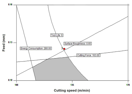 As mentioned above, some machining responses require contradicting cutting parameter settings. Therefore, a compromise solution is necessary to select the cutting parameters. A relatively straightforward approach that is used to optimize several responses is to overlay or superimpose the contour plots for each response. This can be performed using the Graphical Optimization function of the statistical software. Based on this approach and using Equations (11)–(14), the overlay plot as shown in Figure 5 is obtained. The criteria for optimizing the responses are then specified and incorporated into the overlay plot. As an example, if it was preferred that the surface roughness produced should be less than 0.65 μm, the coated carbide tools should last at least six minutes, the cutting force should be less than 163 N, and the machining energy consumption should be less than 280 kWs, then, the shaded, grey region represents the combinations of cutting speed and feed fulfilling the criteria specified. This region can be visually examined further to determine the appropriate operating conditions to be utilized.