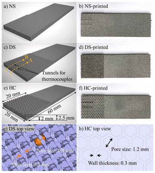 Since it is difficult to achieve effective direct bonding between TC4 and non-polar UHMWPE [9,17,18], different surface structures were designed on the metal plates to enhance the macromechanical interlocking. The parameter details of the surface structures are shown in Table 3, while the models and printed plates with different surface structures are presented in Figure 1. In order to the study influence of different surface structures on the interfacial strength, an as-printed, non-structured plate without a porous layer (referred to as “NS”) was fabricated and set as a reference group. In the meantime, a smooth plate (referred to as “SP”) of rolled commercial TC4 was also necessary for comparison with NS for better understanding of the interfacial bonding mechanism between TC4 and UHMWPE and to figure out the effects of EBM method on enhancing the mechanical properties. Therefore, both SP and NS were references for different purposes in this work. It is worth noting that the surface produced via EBM additive manufacturing was rougher than that produced via by rolling (as shown in Figure 1a,b). Surface roughness was measured and analyzed using a profilometer (MountainsMap Preminum 7.4.8). Additionally, another two types of macroscale structures were constructed and studied. The diamond-shaped architecture (referred to as “DS”) contained a regular tetrahedron as the unit cell, with a strut size of 0.3 mm (diameter). Pore size is generally defined as the distance between two opposite walls of a pore [25]. According to this definition, the pore size of the DS architecture was actually the diameter of the inscribed sphere inside the unit cell, which was 0.9 mm (shown in Figure 1g). Meanwhile, the honeycomb architecture (referred to as “HC”) with a regular hexagon prism as the unit cell was fabricated to reduce the architectural complexity. The strut size and pore size were 0.3 mm and 1.2 mm, respectively (shown in Figure 1h). For all TC4 alloy plates, two 1.1 × 1.1 × 10 mm3 tunnels were designed at the side of the bulk layer to set the K-type thermocouples for temperature measurement at the center and the region located 2 mm from the center (positions A and B, respectively. in Figure 1c).