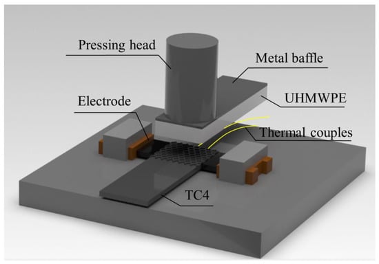 In this study, joining of TC4 and UHMWPE was performed using a self-designed hot pressing joining system with independent control of the joining force and heat input. A 3D schematic is shown in Figure 2. Before joining, the TC4 plate was fixed using two electrodes, while the UHMWPE plate was placed on a specimen holder. Electrodes were tightly attached on both sides of the metal plate to conduct the current during joining, leading to a relatively symmetrical temperature distribution.