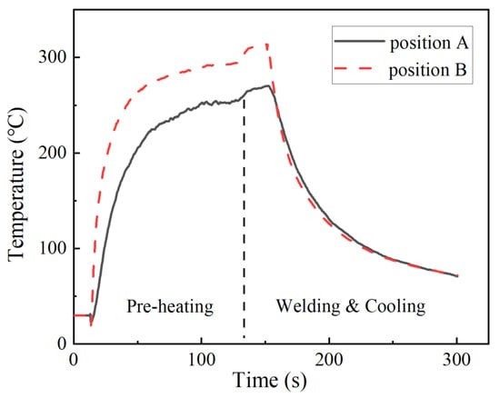 In order to better control the joining temperature, K-type thermocouples (OMEGA, Norwalk, LA, USA) were inserted into the TC4 tunnels to record the temperature of the lap interface. Figure 3 shows the temperature history during the joining process. Temperatures higher than 250 °C were optimal for joining. Here, although the maximum temperature difference was ~40 °C, the temperature range was still controlled at the appropriate joining temperature (250–300 °C), which was proven by our previous research results [9,18]. Meanwhile, the UHMWPE did not degrade severely until being heated to 400 °C [18]. To enhance the polymer fluidity, a metal plate placed at the bottom was preheated to around 290 °C. Then, the polymer plate was lowered down to contact the metal plate to form a 20 × 20 mm2 overlapped joining area. After being pressed and softened, the polymer was filled into the porous layer under a maximum pressure of 5 MPa. The plunge depth was set to 0.5 mm, the same as the thickness of the porous layer. The joint was then cooled down to room temperature while maintaining the pressing head position. It is worth noting that there was a metal baffle between the pressing head and polymer plate, which prevented serious joint deformation during joining.