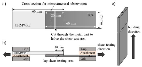 Ultra-high molecular weight polyethylene (UHMWPE) exhibits very high wear resistance, impact toughness, chemical resistance, and lubricity due to its extremely long molecular chains (>106 g/mol), and is the most commonly used polymer material in artificial implants [1,2]. Meanwhile, titanium alloy is also widely used in biomedical fields, since it has high strength, good corrosion resistance, and excellent biocompatibility [3]. Combining the advantages of UHMWPE and titanium can improve the biomechanical functions of artificial joints. For example, in artificial temporomandibular joint prostheses, Ti6Al4V titanium alloy (TC4) serves as the main structure to provide strength, while UHMWPE is used as glenoid fossa material to ensure the wear resistance of such joints [4,5]. Therefore, developing effective joining techniques for these two materials is critically important.