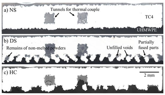 The macro surface structure can strengthen the mechanical interlocking between metals and polymers. Meanwhile, the differences in the macroporous architecture itself can also have an obvious impact. Compared with HC, it was revealed that the failure path of the joints in the DS group was quite complicated, leading to the highest failure displacement due to the failure of the porous architecture. However, it can be seen that the simplification of the architecture of the porous layer (from DS to HC) reduced the difficulty of the manufacturing process. Specifically, based on the metallographic observation of the cross-section (shown in Figure 5 and Figure 6), especially for the HC architecture, it can be seen that the forming accuracy of the structure was improved and the amounts of unmelted powders remaining in the pores were greatly reduced. Meanwhile, no obvious defects were observed in the metal structure of HC itself. Additionally, surface structuring had an obvious effect on the filling behavior of UHMWPE into TC4 porous architecture. For the DS architecture, the polymer did not completely fill into the porous layer. In contrast, the NS plate and the simplified HC architecture (shown in Figure 5a,c) were almost completely filled, with incomplete filling only in the peripheral area. Thus, the simplified structure can allow more effective filling, which is of great significance in guiding the structure design of metal surfaces in order to enhance metal–polymer joints.