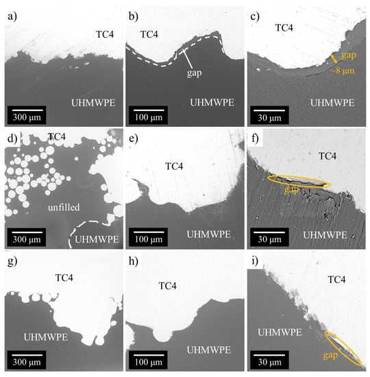 To further evaluate the bonding quality between TC4 and UHMWPE, microscale interfaces of joints were characterized using SEM and are shown in Figure 6. It can be seen that the type of surface structure affected the accuracy of the additive manufacturing. There were large quantities of partially melted metal powder remaining in the pores of the DS group, which were attributed to the complexity of the diamond architecture (shown in Figure 6d). In contrast, NS and HC plates had better forming quality with quite few unmelted powders (shown in Figure 6a,g). Additionally, in the NS group, although UHMWPE easily filled the surface pits, there were still some narrow gaps (5–10 μm) at the interface due to the local stress caused by shrinkage of the polymer during cooling (shown in Figure 6b,c), which was reported and well demonstrated in our previous study [9]. However, the microscale bonding between TC4 and UHMWPE in groups DS and HC was much tighter (shown in Figure 6e,h)—only a few discontinuous gaps with widths of 1–5 μm could be observed in the joints (shown in Figure 6f,i).