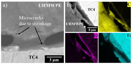 Furthermore, the location-dependent interfacial bonding of the joints in the DS group is shown in Figure 7. Similar shrinkage behavior for UHMWPE during cooling was also observed here, leading to microcracks in the UHMWPE at the interface. An EDS mapping approach detected the oxygen-rich element at the interface. The oxygen-rich area only overlapped with the carbon-rich area, which excluded the possibility of titanium oxidation. The oxygen element only came from the UHMWPE itself. Since the UHMWPE itself had no oxygen in its original composition, oxidation of the UHMWPE at the interface was highly possible.