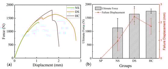 The mechanical properties of the joints of each group were tested and averaged from three samples, and the results are presented in Figure 8 and Table 4. It should be noted that the ultimate force in Figure 8b corresponds to the highest point in the tensile curve shown in Figure 8a. As mentioned previously, since it was hard to form an effective direct bond between the smooth TC4 plate and the UHMWPE, the joint strength (quite low) was set as a comparison, whereby the UHMWPE was barely bonded to TC4. It is worth noting that the joint strength of groups NS, DS, and HC was significantly improved, indicating that modifying the surface via EBM additive manufacturing was an effective strategy to enhance the performance of the metal–polymer joint.
