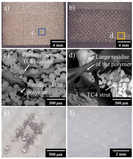 To further study the fracture behavior of TC4–UHMWPE joints with different surface structures, the fractured surfaces were analyzed in detail. Figure 9 shows the characterization results. Compared with DS and HC, only a few residues of the UHMWPE polymer remained on the fractured surface (shown in Figure 9a,c). Thus, the joint without the porous surface architecture exhibited weak shear force resistance and low ductility. As we know, the DS architecture provided an interconnecting porous layer. As a result, the polymer matrix provided high resistance against pulling-out effect during the lap shearing test. Large fragments of the teared-out polymer remained after shearing, indicating a locally high joint strength (shown in Figure 9b,d). However, the complexity of the cell architecture impeded the flow of the softened polymer. The insufficient filling of the polymer along with the unfilled voids was the major reason for the instability of the mechanical performance. Additionally, the tilted struts of the DS architecture also increased the difficulty of fabrication using additive manufacturing methods [26]. Large fragments of the TC4 structure were found (shown in Figure 9e) after failure. Although it exhibited the highest failure displacement, its overall strength was relatively low (shown in Figure 8b). However, the HC architecture was somewhat of a trade-off. The simplified hexagonal prism cell design made the filling of the polymer easier during the joining process and full integration of the polymer and metal matrix was achieved. No fracturing of the porous architecture was found after tensile testing (shown in Figure 9f). The relatively decreased porosity enhanced the mechanical strength of the porous architecture [27]. Defects were also diminished due to their reduced complexity [26]. As a result, the HC architecture showed better mechanical strength with less deviation.