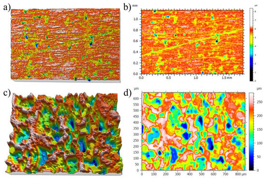 The 3D and 2D morphologies of the surface structures: (a,b) smooth plate (SP); (c,d) non-structured (NS) plate.