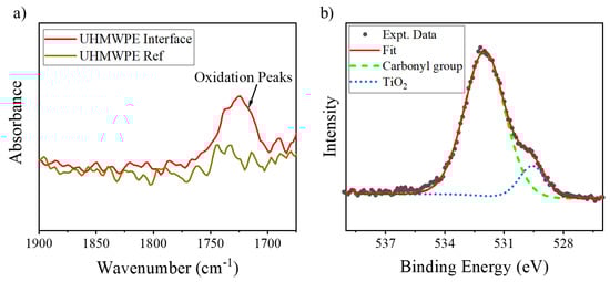 (a) FTIR results showing an additional peak after hot pressing, corresponding to the carbonyl groups (UHMWPE interface was from the top surface of the UHMWPE side of the fractured joint); (b) XPS spectra (O 1s) collected from the top surface of the TC4 side of the fractured joint.