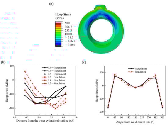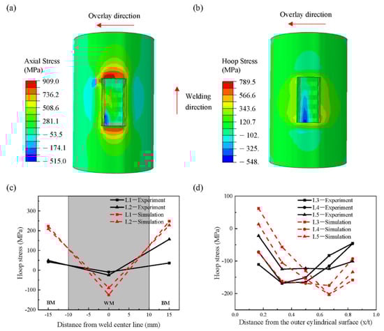 - Under the weld repair influence, the repaired area below the weld overlay is mainly in −200 to 0 MPa compression, balanced by 0–400 MPa tensile stress in the weld overlay and around the outer surface area of the tube.