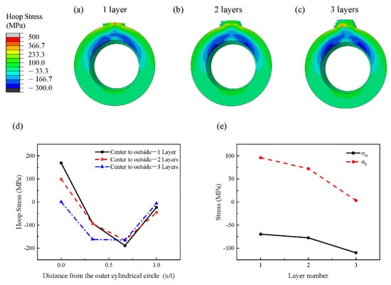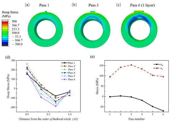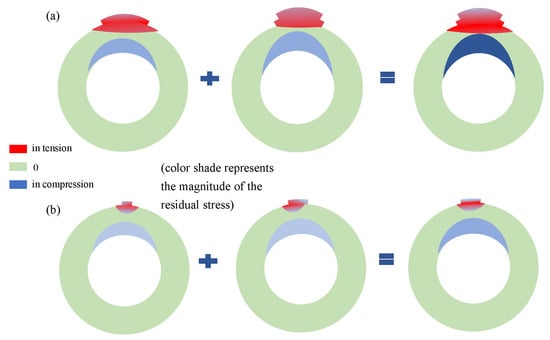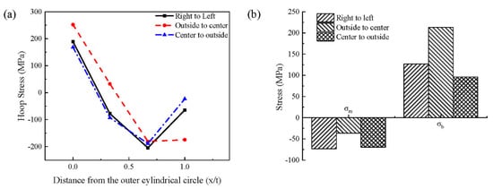 - Under the condition of overlaying one layer, the of center-to-outside is −70 MPa, close to right-to-left’s −73 MPa, and higher than outside’s −37 MPa. The of center-to-outside is 96 MPa, lower than right-to-left’s 127 MPa and outside-to-center’s 213 MPa. Hence the order of the weld overlay effect is as follows: center-to-outside > right-to-left > outside-to-center.