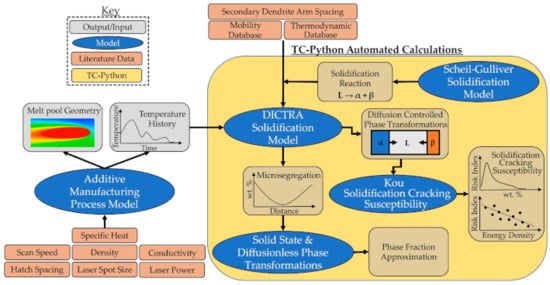 Figure 1 shows how the models used in this work are coupled together using the TC-Python application programing interface to create an automated CALPHAD-based ICME framework for modeling solidification in additively manufactured materials. The TC-Python application programing interface is used to automate the Scheil-Gulliver, equilibrium, and DICTRA solidification calculations presented in this work. Integrating the LPBF process model, DICTRA calculations, and the SCS model defined by Kou using the TC-Python application programing interface expedites the tedious process of running models and post-processing data. Calculation results, such as microsegregation and SCS, are automatically post-processed and saved in a convenient text file format. This automated workflow enables the user to efficiently model large ranges in processing conditions and multicomponent composition space. The connection between macroscale process simulations and CALPHAD solidification models simplifies the complex process-microstructure relationship in additively manufactured materials into a resolvable problem by considering processing effects on the temperature history at a microstructural scale.