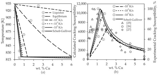(a) Modeling the effect of cooling rate on the solidus temperature of Al-Cu alloys using the equilibrium, Scheil-Gulliver, and diffusion-controlled transformations (DICTRA) solidification models available in Thermo-Calc software. (b) Solidification cracking susceptibility of Al-Cu alloys calculated by the DICTRA and Scheil-Gulliver models using the Kou solidification cracking susceptibility model. The trend in solidification cracking susceptibility predicted by the model is compared with experimentally observed solidification crack susceptibility data plotted on the secondary y-axis. This data was reproduced from [].
