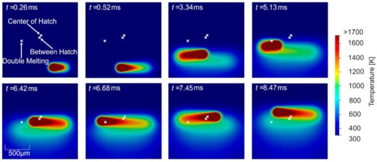 The LPBF process model used in this work to predict the temperature history during additive manufacturing of SS316L consisted of a single layer 1080 µm square with a bidirectional raster scanning pattern and a 90 µm hatch spacing. The material properties were taken at 700 K by performing a linear interpolation of the properties given by Khairallah et al. [], yielding a density of 7.9 g/(cm3), thermal conductivity of 20.2 W/(m·K), and specific heat of 470 J/(kg·K). This temperature was chosen as previous results have shown that the melt pool dimensions in SS316L are more accurate when modeled using material properties from this elevated temperature range. Zero flux boundary conditions are applied to the top and sides of the substrate and the bottom has a constant temperature consistent with the initial temperature (300 K). These boundary conditions are consistent with those used during the validation of the thermal model. The model was run with a selection of laser velocities, 0.8–1.2 m/s varying by 0.2 m/s, and laser powers 170–190 W varying by 10 W based on the optimal parameters proposed by Yan et al. []. A range of processing parameters was investigated to determine if the CALPHAD-based ICME framework can predict the effect of processing conditions on non-equilibrium solidification. The results were then inspected to determine which locations may be of interest to the microstructural model. These points were chosen to give a broad representation of thermal histories produced by the model. Three subsets of points were selected; the first were points from a cross section of the melt pool to capture dependence on relative location. Second, points were selected that melted more than once. Lastly, points were selected with higher and lower than average cooling rates. These points were down-selected to three points; one which rapidly remelted, one at the center of the path, and one between subsequent passes. This down-selection was carried out to avoid convergence issues with the DICTRA model for certain cooling curves. Figure 3 shows the development of the thermal field as the laser moves through the bidirectional raster scanning pattern. The white X’s shown in Figure 3 mark the location of temperature histories used as inputs to the CALPHAD-based ICME framework.