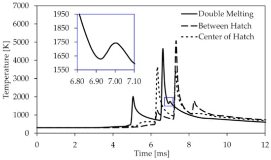 Thermal history of additively manufactured stainless steel 316L generated using the laser powder bed fusion process model developed by Wolfer et al. at a location between the hatch lines, in the center a hatch line, and at a location that undergoes rapid double melting. The inset figure is taken from the area marked by the blue square to highlight the rapid double melting seen at various locations in the model.