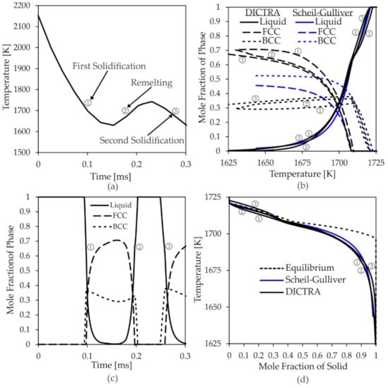 Non-equilibrium solidification modeling of stainless steel 316L undergoing rapid double melting. (1) corresponds to the first solidification transformation, (2) refers to remelting, and (3) marks the second solidification transformation. (a) Temperature history with rapid double melting directly used as an input to the diffusion-controlled transformations (DICTRA) model. (b) Mole fraction of each phase as a function of temperature predicted using the DICTRA and Scheil-Gulliver models. (c) Mole fraction of each phase as a function of time modeled using DICTRA. (d) Temperature versus the mole fraction of solid as predicted by the equilibrium, Scheil-Gulliver, and DICTRA models for solidification.