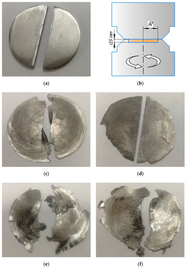 (a) two halves of the Zr-1%Nb disk for combined HPT, (b) sketch of combined HPT, (c) two halves after combined HPT n = 1/4, (d) two halves after specimen cutting, HPT n = 2; (e) halves after HPT n = 2 + cutting + combined HPT n = 1; (f) halves after HPT n = 5 + cutting + combined HPT n = 1/4.